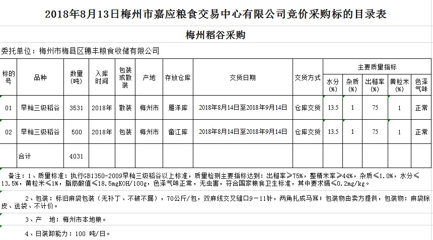 受客戶委托,梅州市嘉應糧食交易中心有限公司定于2018年8月13日(星期一)舉辦糧食競價交易會,梅州市梅縣區(qū)穗豐糧食收儲有限公司擬采購2018年早秈稻4031噸。