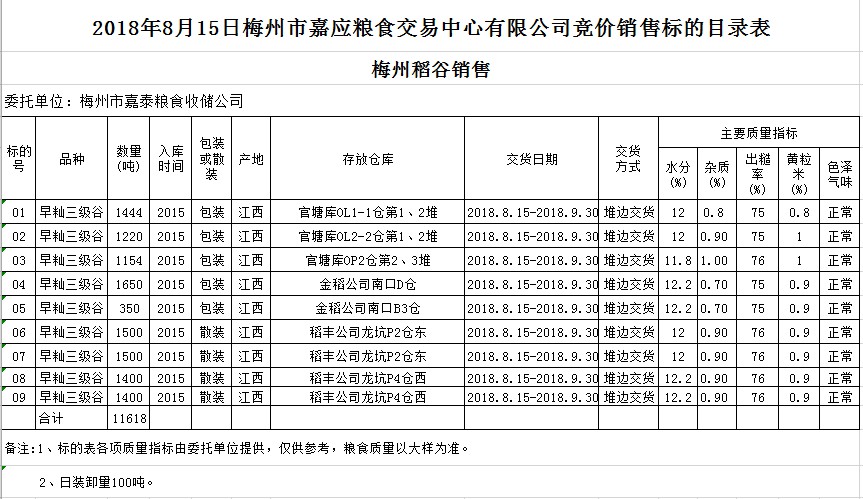 受客戶委托,梅州市嘉應(yīng)糧食交易中心有限公司定于2018年8月15日(星期三)舉辦糧食競(jìng)價(jià)交易會(huì),梅州市嘉泰糧食收儲(chǔ)公司擬銷售早秈稻11618噸。
