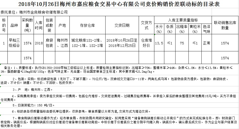受客戶委托,梅州市嘉應糧食交易中心有限公司定于2018年10月26日(星期五)舉辦稻谷購銷價差聯(lián)動標的交易會,梅州市金良糧食收儲有限公司擬銷售和采購早秈稻1574噸。