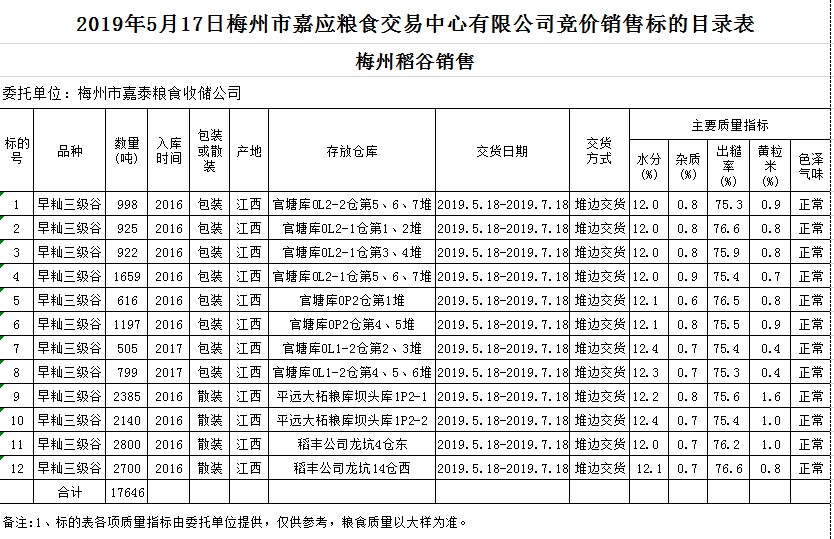 受客戶委托,梅州市嘉應(yīng)糧食交易中心有限公司定于2019年5月17日(星期五)舉辦糧食競(jìng)價(jià)交易會(huì),梅州市嘉泰糧食收儲(chǔ)公司擬銷售2016年、2017年早秈稻17646噸。