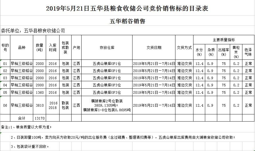 受客戶委托,梅州市嘉應(yīng)糧食交易中心有限公司定于2019年5月21日(星期二)舉辦糧食競價交易會,廣東省五華縣糧食收儲公司擬銷售2016年早秈稻13169.1305噸,2018年早秈稻0.8695噸。