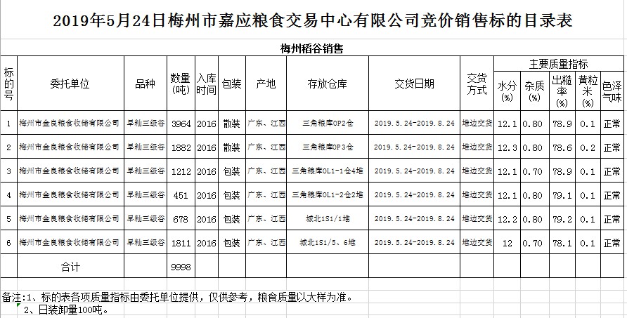 受客戶(hù)委托,梅州市嘉應(yīng)糧食交易中心有限公司定于2019年5月24日(星期五)舉辦糧食競(jìng)價(jià)交易會(huì),梅州市金良糧食收儲(chǔ)有限公司擬銷(xiāo)售早秈稻9998噸。