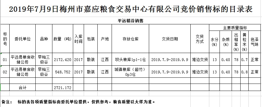 受客戶委托,梅州市嘉應(yīng)糧食交易中心有限公司定于2019年7月9日(星期二)舉辦糧食競價(jià)交易會,平遠(yuǎn)縣糧食收儲公司擬銷售2017年早秈稻2721.172噸。