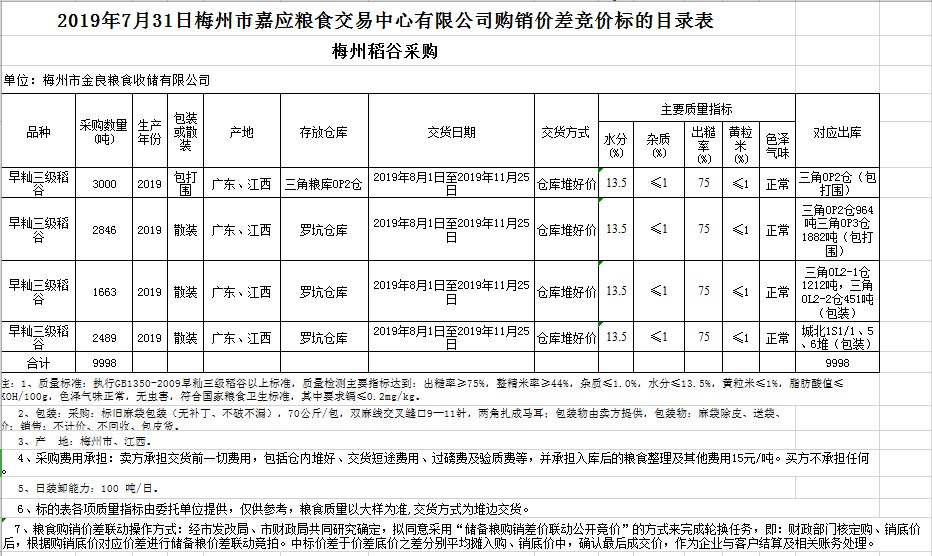 受客戶委托,梅州市嘉應(yīng)糧食交易中心有限公司定于2019年7月31日(星期三)舉辦稻谷購銷價(jià)差聯(lián)動(dòng)標(biāo)的交易會(huì),梅州市金良糧食收儲(chǔ)有限公司擬銷售和采購早秈稻9998噸。