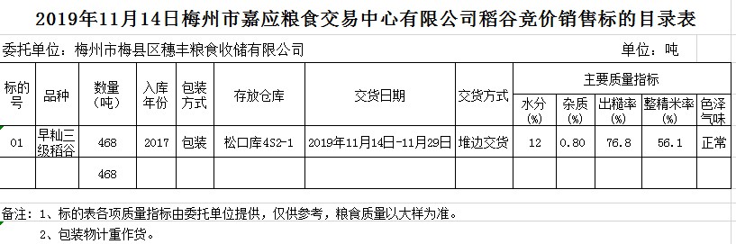 受客戶委托,梅州市嘉應(yīng)糧食交易中心有限公司定于2019年11月14日(星期四)舉辦糧食競價(jià)交易會(huì),梅州市梅縣區(qū)穗豐糧食收儲(chǔ)有限公司擬銷售2017年早秈稻468噸。