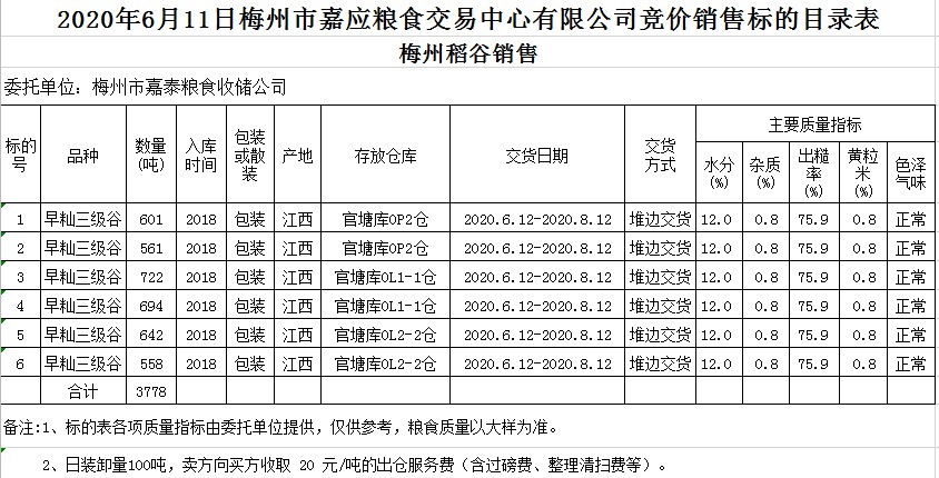 受客戶(hù)委托,梅州市嘉應(yīng)糧食交易中心有限公司定于2020年6月11日(星期四)舉辦糧食競(jìng)價(jià)交易會(huì),梅州市嘉泰糧食收儲(chǔ)公司擬銷(xiāo)售2018年早秈稻3778噸。