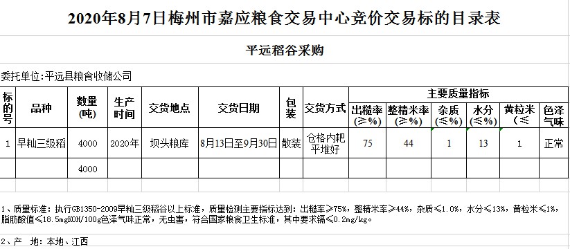 受客戶委托,梅州市嘉應(yīng)糧食交易中心有限公司定于2020年8月7日(星期五)舉辦糧食競價交易會,平遠縣糧食收儲公司擬采購2020年早秈稻4000噸。