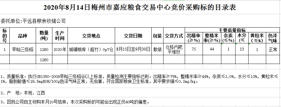 交易時間和地點:2020年8月14日(星期五)上午10時。廣東省梅州市彬芳大道南161號梅州市糧食交易中心3樓。