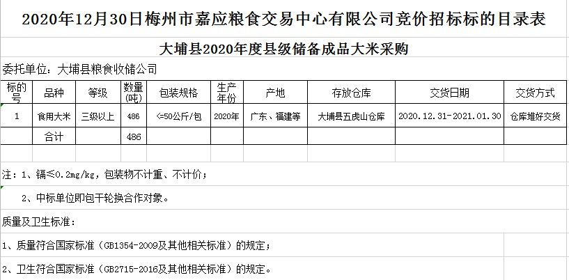 受客戶委托,梅州市嘉應糧食交易中心有限公司定于2020年12月30日(星期三)上午10時在廣東省梅州市彬芳大道南161號梅州市糧食交易中心3樓,舉辦大埔縣縣級儲備成品糧采購公開招標。