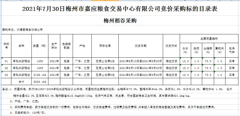 受客戶委托,梅州市嘉應(yīng)糧食交易中心有限公司定于2021年7月30日(星期五)舉辦糧食競價(jià)交易會(huì)。大埔縣糧食收儲(chǔ)公司擬采購2021年早秈稻5233.164噸。