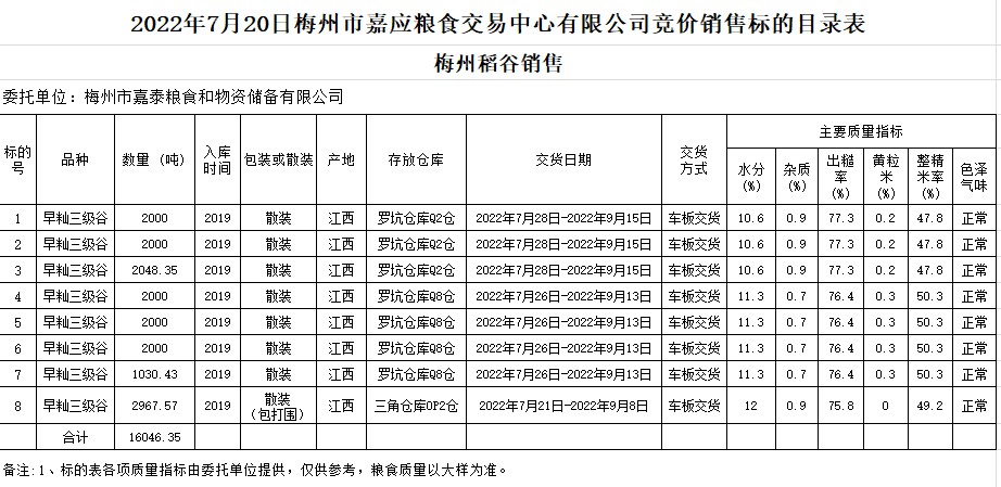 受客戶(hù)委托,梅州市嘉應(yīng)糧食交易中心有限公司定于2022年7月20日(星期三)舉辦糧食競(jìng)價(jià)交易會(huì)。梅州市嘉泰糧食和物資儲(chǔ)備有限公司擬銷(xiāo)售2019年早秈稻16046.35噸。