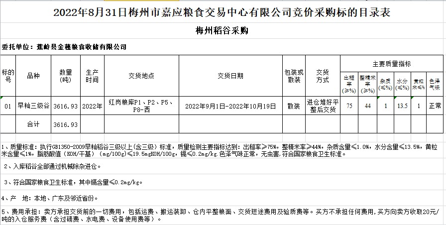 受客戶委托,梅州市嘉應(yīng)糧食交易中心有限公司定于2022年8月31日(星期三)舉辦糧食競價(jià)交易會。蕉嶺縣金穗糧食收儲有限公司擬采購2022年早秈稻3616.93噸。