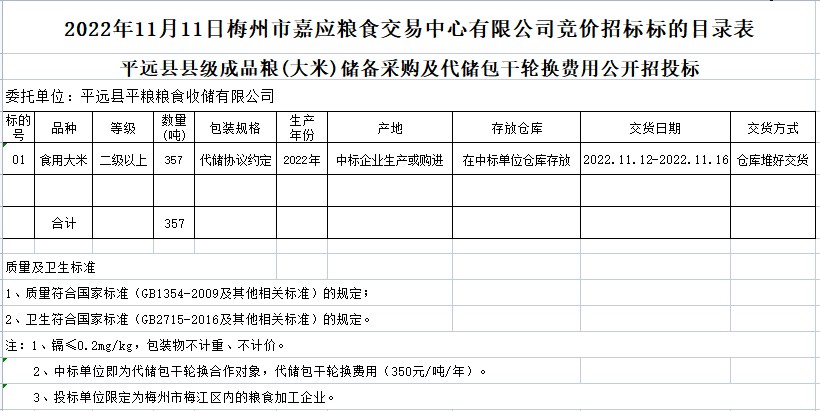 受客戶委托,梅州市嘉應(yīng)糧食交易中心有限公司定于2022年11月11日(星期五)上午10時在廣東省梅州市彬芳大道南161號梅州市糧食交易中心3樓,舉辦平遠縣縣級儲備成品糧采購公開招標。