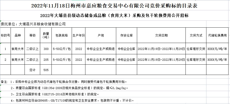 2022年大埔縣縣級(jí)動(dòng)態(tài)儲(chǔ)備成品糧采購及包干輪換費(fèi)用公開招標(biāo)公告