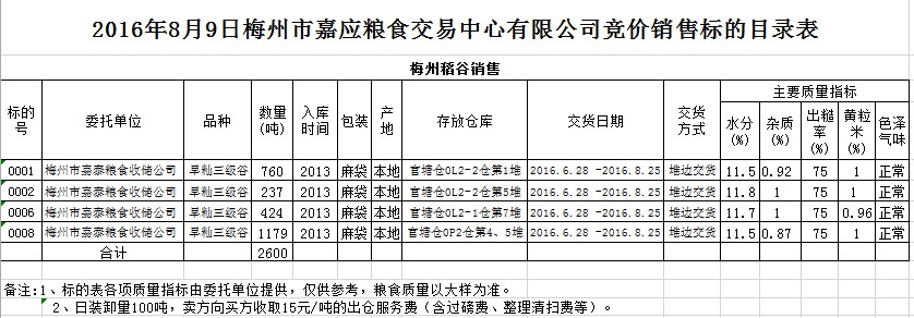 受客戶委托,梅州市嘉應糧食交易中心有限公司定于2016年8月9日舉辦糧食競價交易會,梅州市嘉泰糧食收儲公司擬銷售2013年產(chǎn)早秈三級稻谷2600噸。