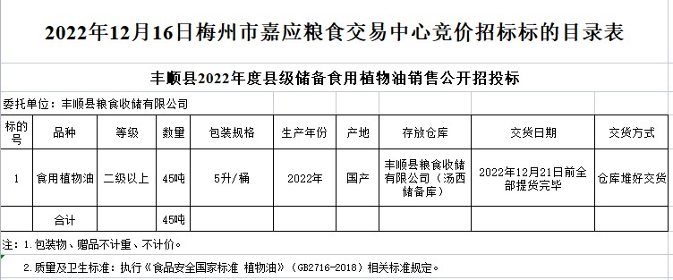 受客戶委托,梅州市嘉應(yīng)糧食交易中心有限公司定于2022年12月16日(星期五)舉辦食用植物油競價(jià)交易會(huì)。豐順縣糧食收儲有限公司擬銷售2022年食用植物油45噸。