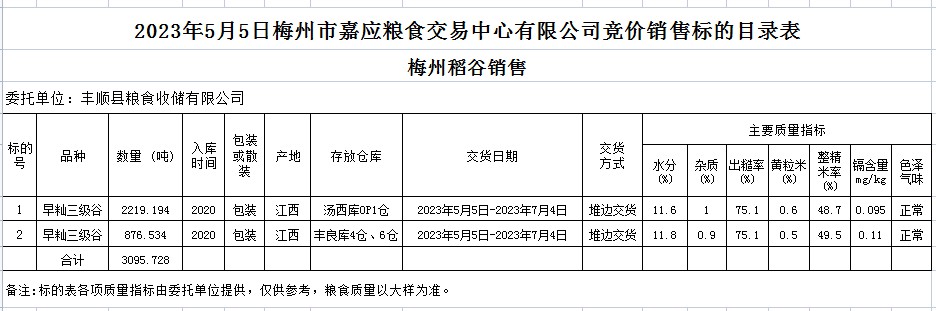 受客戶委托,梅州市嘉應糧食交易中心有限公司定于2023年5月5日(星期五)舉辦糧食競價交易會。豐順縣糧食收儲有限公司擬銷售2020年早秈稻3095.728噸。