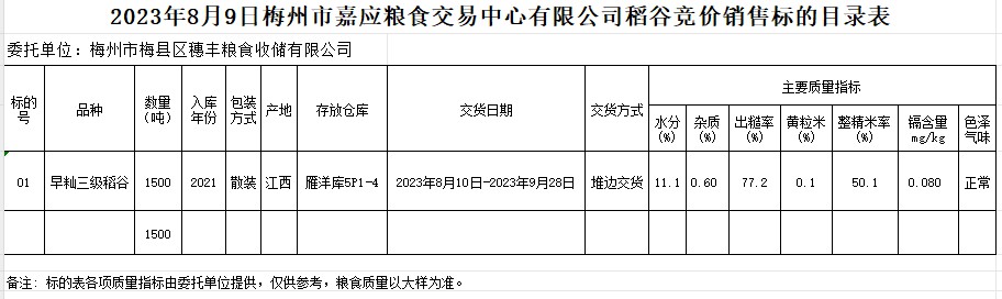 受客戶委托,梅州市嘉應(yīng)糧食交易中心有限公司定于2023年8月9日(星期三)舉辦糧食競價(jià)交易會。梅州市梅縣區(qū)穗豐糧食收儲有限公司擬銷售2021年早秈稻1500噸。