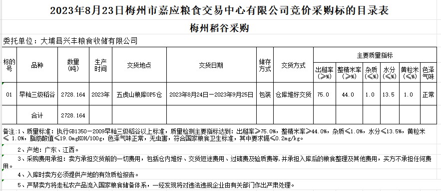 受客戶委托,梅州市嘉應(yīng)糧食交易中心有限公司定于2023年8月23日(星期三)舉辦糧食競價(jià)交易會(huì)。大埔縣興豐糧食收儲(chǔ)有限公司擬采購2023年早秈稻2728.164噸。