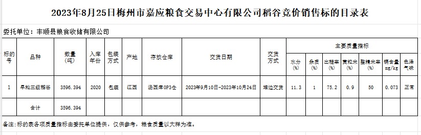 受客戶委托,梅州市嘉應(yīng)糧食交易中心有限公司定于2023年8月25日(星期五)舉辦糧食競價交易會。豐順縣糧食收儲有限公司擬銷售2020年早秈稻3596.394噸。