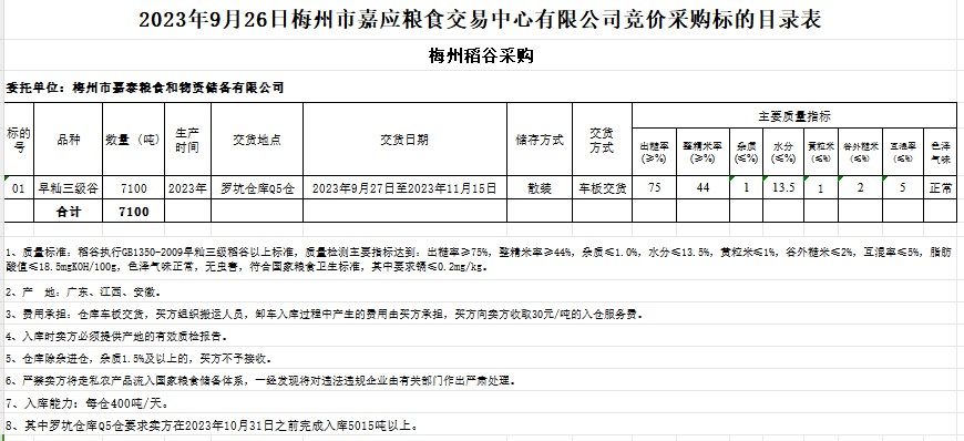 受客戶委托,梅州市嘉應(yīng)糧食交易中心有限公司定于2023年9月26日(星期二)舉辦糧食競(jìng)價(jià)交易會(huì)。梅州市嘉泰糧食和物資儲(chǔ)備有限公司擬采購(gòu)2023年早秈稻谷7100噸。