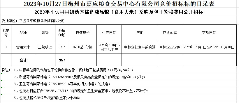 受客戶委托,梅州市嘉應(yīng)糧食交易中心有限公司定于2023年10月27日(星期五)上午10時(shí)在廣東省梅州市彬芳大道南161號(hào)梅州市糧食交易中心3樓,舉辦平遠(yuǎn)縣縣級(jí)成品糧采購及包干輪換費(fèi)用公開招標(biāo)。