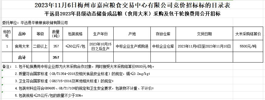 受客戶委托,梅州市嘉應糧食交易中心有限公司定于2023年11月6日(星期一)上午10時在廣東省梅州市彬芳大道南161號梅州市糧食交易中心3樓,舉辦平遠縣2023年縣級動態(tài)儲備成品糧(食用大米)采購及包干輪換費用公開招標。