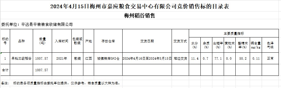 受客戶委托,梅州市嘉應糧食交易中心有限公司定于2024年4月15日(星期一)舉辦糧食競價交易會。平遠縣平糧糧食收儲有限公司擬銷售2021年產(chǎn)早秈稻1007.57噸。