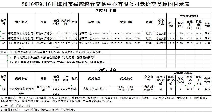 受客戶委托,平遠(yuǎn)縣糧食收儲公司擬銷售2014年早秈三級稻谷2500噸、采購2016年產(chǎn)早秈三級稻谷2250噸。