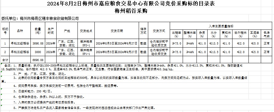 受客戶委托,梅州市嘉應(yīng)糧食交易中心有限公司定于2024年8月2日(星期五)舉辦糧食競價交易會。梅州市梅縣區(qū)穗豐糧食收儲有限公司擬采購2024年產(chǎn)早秈稻6696.08噸。