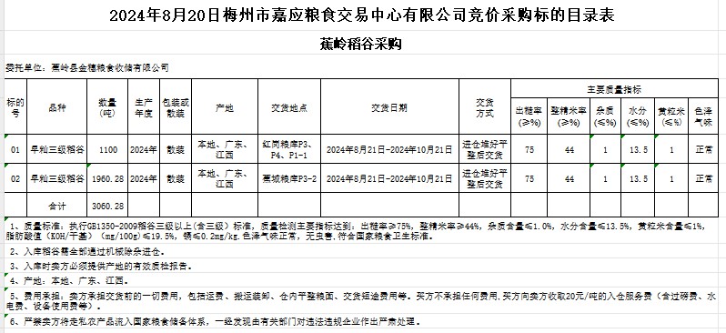 受客戶(hù)委托,梅州市嘉應(yīng)糧食交易中心有限公司定于2024年8月20日(星期二)舉辦糧食競(jìng)價(jià)交易會(huì)。蕉嶺縣金穗糧食收儲(chǔ)有限公司擬采購(gòu)2024年產(chǎn)早秈稻3060.28噸。