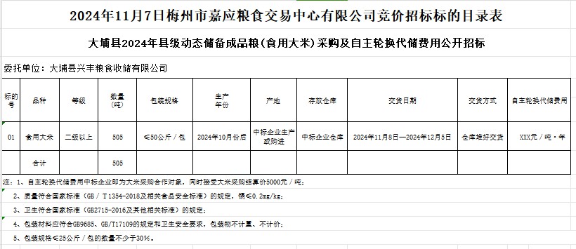 大埔縣2024年縣級(jí)動(dòng)態(tài)儲(chǔ)備成品糧(食用大米)采購(gòu)及自主輪換代儲(chǔ)費(fèi)用公開(kāi)招標(biāo)公告
