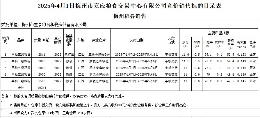 受客戶委托,梅州市嘉應(yīng)糧食交易中心有限公司定于2025年4月1日(星期二)舉辦糧食競(jìng)價(jià)交易會(huì)。梅州市嘉泰糧食和物資儲(chǔ)備有限公司擬銷(xiāo)售2022年產(chǎn)早秈稻谷10344噸。