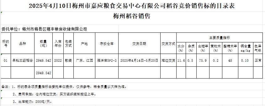 受客戶委托,梅州市嘉應(yīng)糧食交易中心有限公司定于2025年4月10日(星期四)舉辦糧食競(jìng)價(jià)交易會(huì)。梅州市梅縣區(qū)穗豐糧食收儲(chǔ)有限公司擬銷(xiāo)售2022年產(chǎn)早秈稻谷2949.542噸。