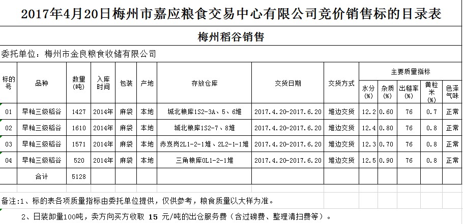 2017年4月20日梅州市金良糧食收儲有限公司稻谷銷售