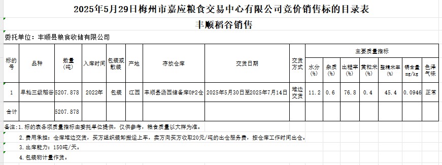 受客戶委托,梅州市嘉應(yīng)糧食交易中心有限公司定于2025年5月29日(星期四)舉辦糧食競價(jià)交易會。豐順縣糧食收儲有限公司擬銷售2022年產(chǎn)早秈稻谷5207.878噸。