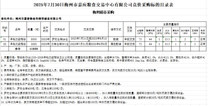 受客戶(hù)委托,梅州市嘉應(yīng)糧食交易中心有限公司定于2025年7月30日(星期三)舉辦糧食競(jìng)價(jià)交易會(huì)。梅州市嘉泰糧食和物資儲(chǔ)備有限公司擬采購(gòu)2025年產(chǎn)早秈稻谷11020噸。