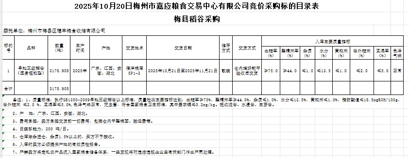 受客戶委托,梅州市嘉應糧食交易中心有限公司定于2025年10月20日(星期一)舉辦糧食競價交易會。梅州市梅縣區(qū)穗豐糧食收儲有限公司擬采購2025年產(chǎn)早秈稻谷3178.908噸。