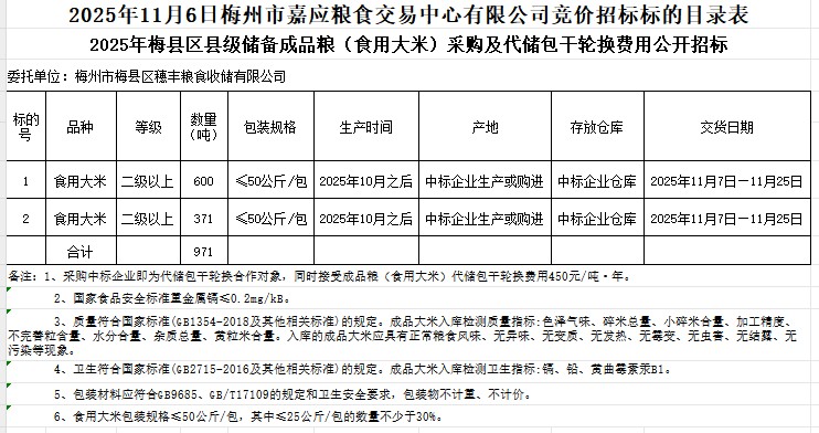 梅縣區(qū)2025年縣級(jí)儲(chǔ)備成品糧(食用大米)采購及代儲(chǔ)包干輪換費(fèi)用公開招標(biāo)公告