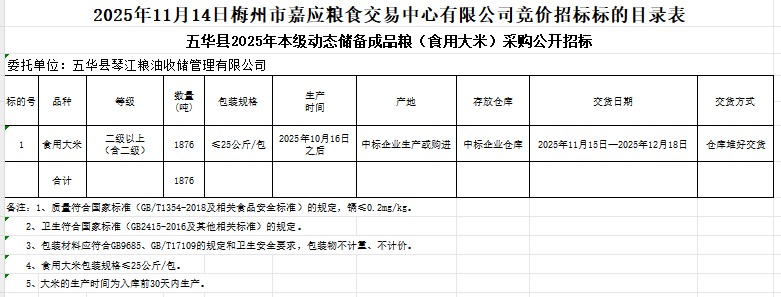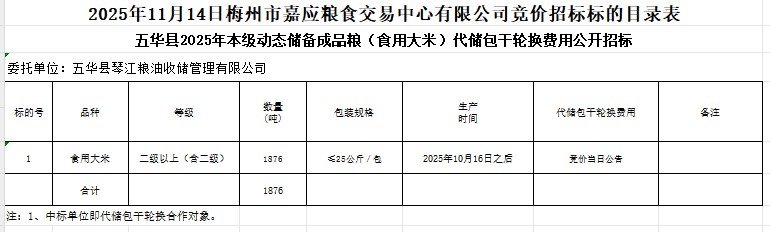五華縣2025年本級動態(tài)儲備成品糧(食用大米)采購及代儲包干輪換費用公開招標(biāo)公告