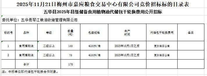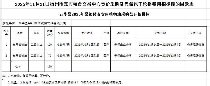 五華縣2025年縣級(jí)儲(chǔ)備食用植物油采購(gòu)及代儲(chǔ)包干輪換費(fèi)用公開(kāi)招標(biāo)公告