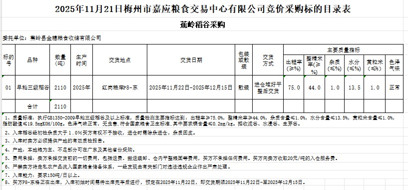 2025年11月21日蕉嶺縣金穗糧食收儲有限公司稻谷采購