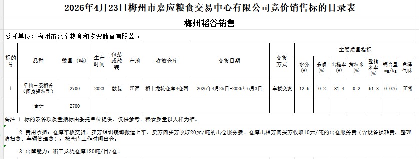 受客戶委托,梅州市嘉應(yīng)糧食交易中心有限公司定于2026年4月23日(星期四)舉辦糧食競價(jià)交易會。梅州市嘉泰糧食和物資儲備有限公司擬銷售2023年產(chǎn)早秈稻谷(圓身短粒型)2700噸。