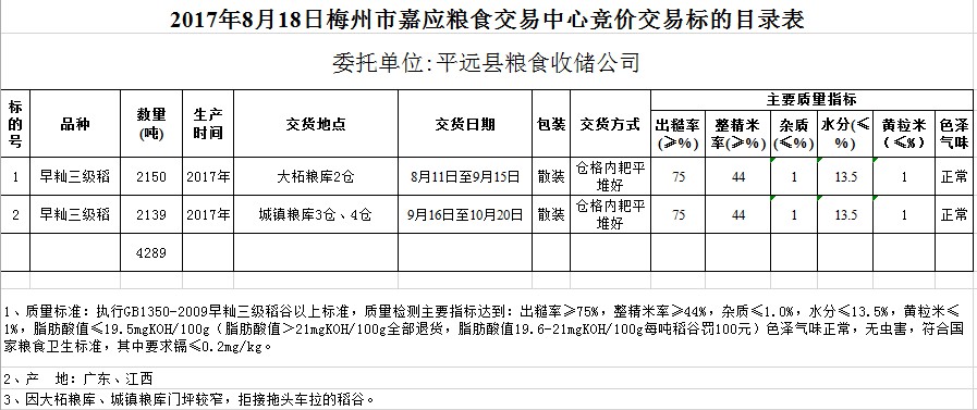 受客戶(hù)委托,梅州市嘉應(yīng)糧食交易中心有限公司定于2017年8月18日舉辦糧食競(jìng)價(jià)交易會(huì),平遠(yuǎn)縣糧食收儲(chǔ)公司擬采購(gòu)2017年早秈三級(jí)稻谷共4289噸。