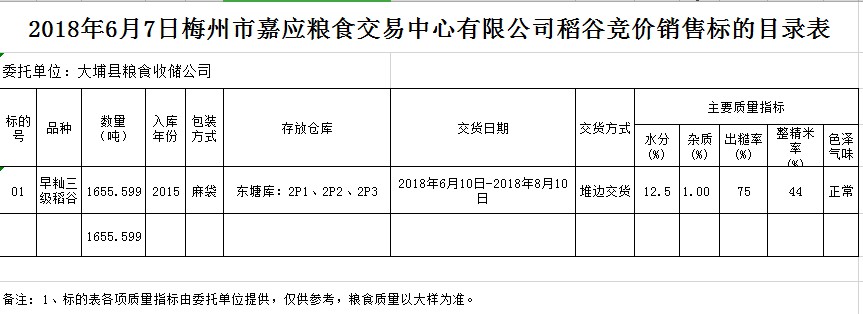 交易時間和地點:2018年6月7日(星期四)上午10時15分。廣東省梅州市彬芳大道南161號梅州市糧食交易中心3樓。