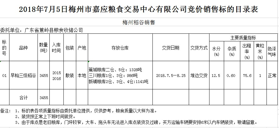受客戶委托,梅州市嘉應(yīng)糧食交易中心有限公司定于2018年7月5日(星期四)舉辦糧食競(jìng)價(jià)交易會(huì),廣東省蕉嶺縣糧食收儲(chǔ)公司擬銷售早秈稻3455噸。