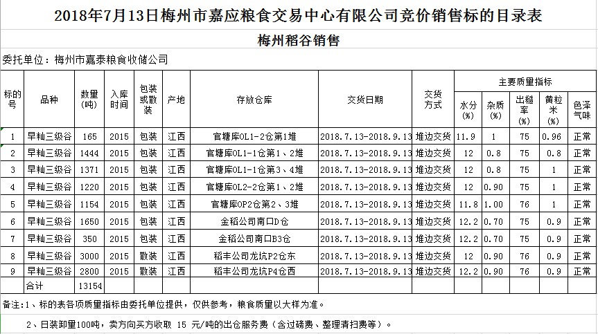 受客戶(hù)委托,梅州市嘉應(yīng)糧食交易中心有限公司定于2018年7月13日(星期五)舉辦糧食競(jìng)價(jià)交易會(huì),梅州市嘉泰糧食收儲(chǔ)公司擬銷(xiāo)售早秈稻13154噸。