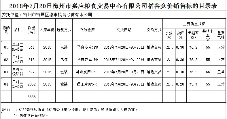 受客戶委托,梅州市嘉應(yīng)糧食交易中心有限公司定于2018年7月20日(星期五)舉辦糧食競(jìng)價(jià)交易會(huì),梅州市梅縣區(qū)穗豐糧食收儲(chǔ)有限公司擬銷(xiāo)售早秈稻3838噸。