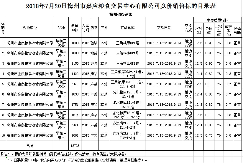 受客戶委托,梅州市嘉應(yīng)糧食交易中心有限公司定于2018年7月20日(星期五)舉辦糧食競價交易會,梅州市金良糧食收儲有限公司擬銷售早秈稻12738噸。