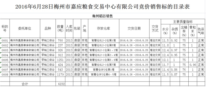 受客戶委托,梅州市嘉應(yīng)糧食交易中心有限公司定于2016年6月28日(星期二)舉辦糧食競價(jià)交易會,梅州市嘉泰糧食收儲公司擬銷售官塘倉庫2013年早秈稻谷6232噸。